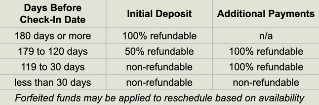 100% of paid prepayments refundable when canceled 60 days before arrival or earlier
