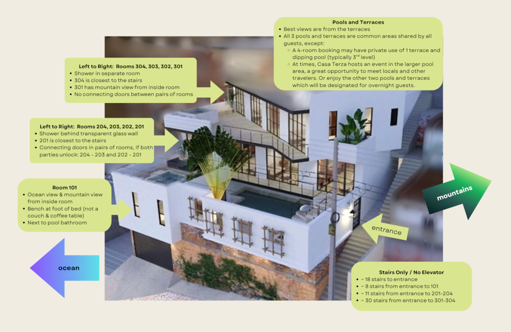 Rooms are comparable and priced the same. The diagram below displays each room's location and other unique features.